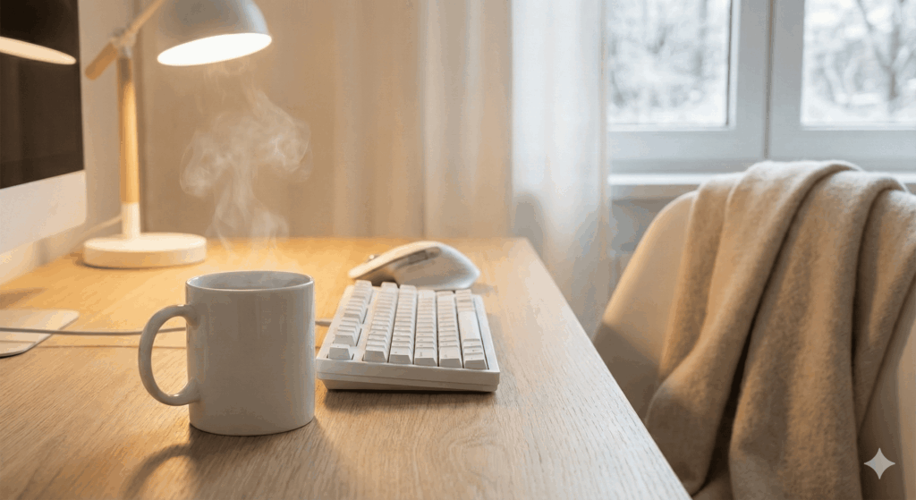 [画像6:冬らしい暖かい光の照明や、マグカップが置かれた温かみのあるデスク]
