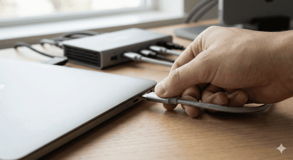 ドッキングステーションは重量のあるアルミ筐体であることが多いため、デスク下のケーブルトレー内、あるいは天板裏に「3Mデュアルロック」等の高強度ファスナーで固定します。これによりデスク上の作業スペースを物理的に100%確保します。 - 単一配線(ワンケーブル・セットアップ):